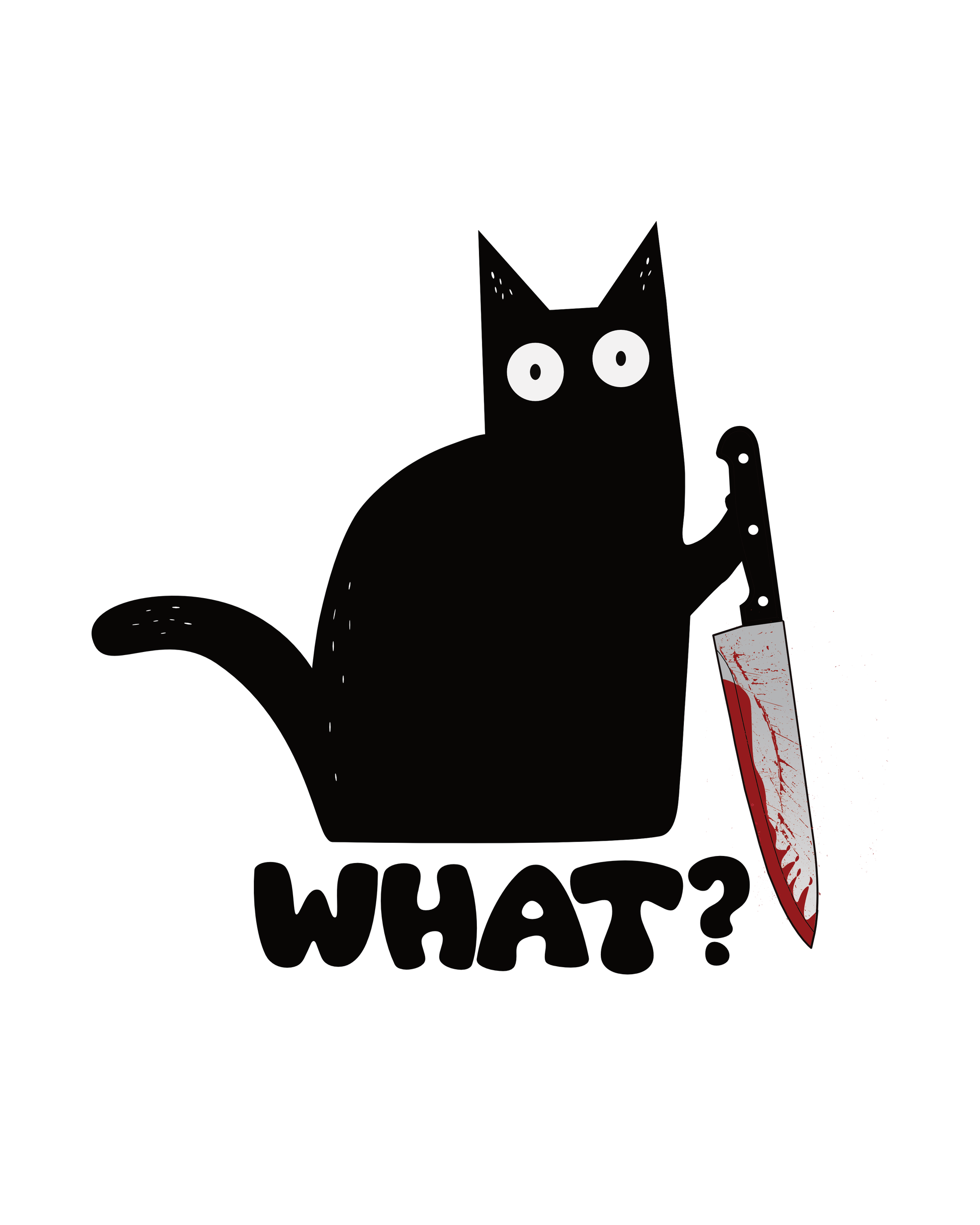 Das „What?“ Unisex T-Shirt zeigt eine schwarze Katze mit riesigen Kulleraugen und einem Küchenmesser – ein perfekter Mix aus süß, düster und absolut komisch.